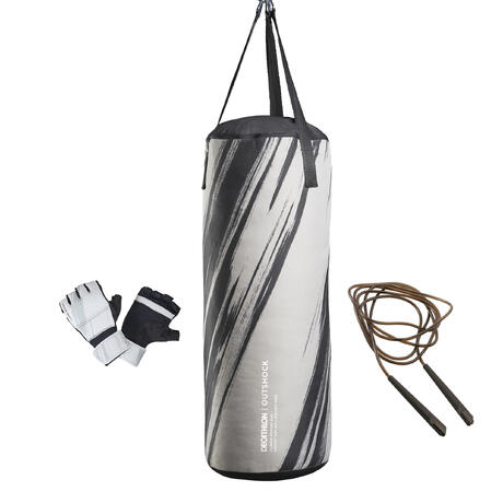 Le kit de boxe comprend un sac de frappe en tissu renforcé pour une résistance optimale. Des mitaines développées spécialement pour les exercices de frappe sur sac. Une corde à sauter pour le cardio.